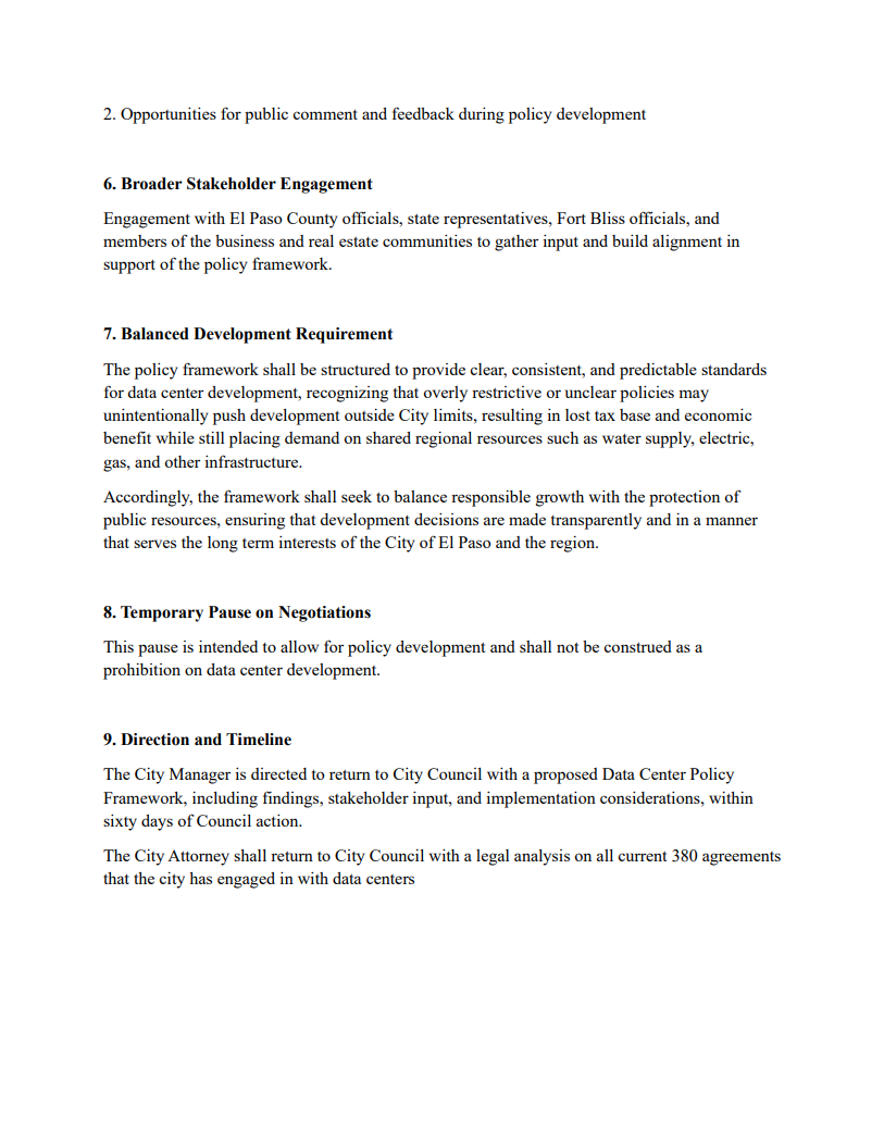 The discussion comes as Meta's announced $1.5 billion artificial intelligence data center project moves forward in northeast El Paso. If approved Tuesday, the city manager would have 60 days to return with findings, stakeholder input, and implementation considerations.