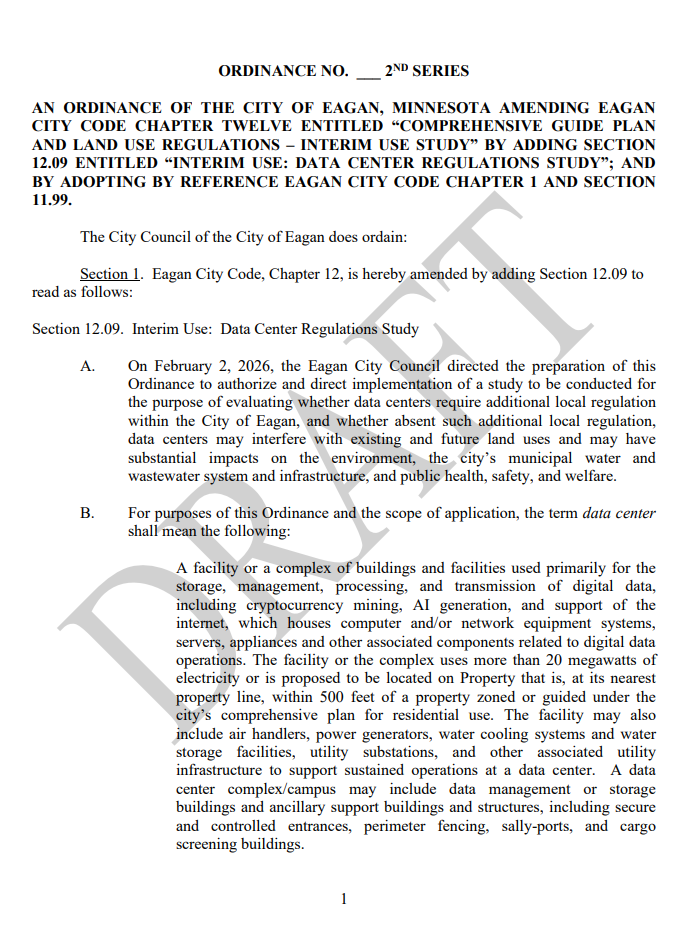 Eagan City Council will vote Tuesday on a one-year moratorium on new data centers and cryptocurrency mining operations, preventing approval of any new applications or expansions until February 17, 2027.
