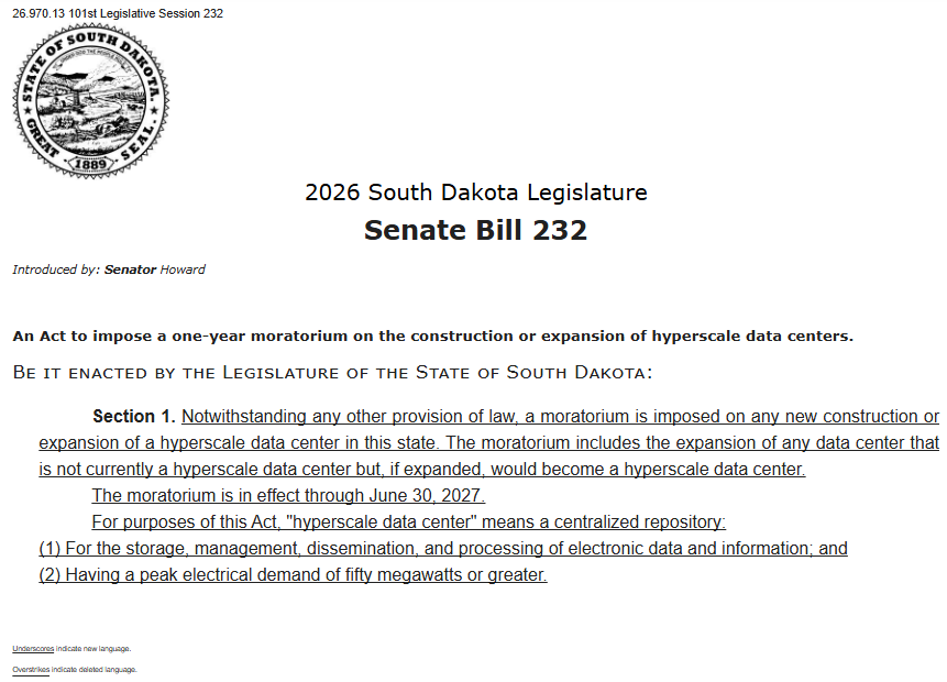 - Maine introduces a moratorium bill targeting data centers requiring 20+ megawatts, months after Lewiston rejected a $300M proposal.