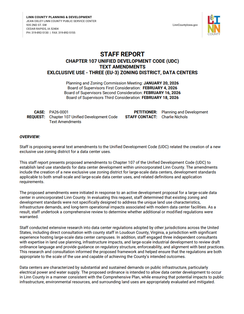 - Linn County, Iowa unanimously approves new data center rules after nearly seven months of public input and development.