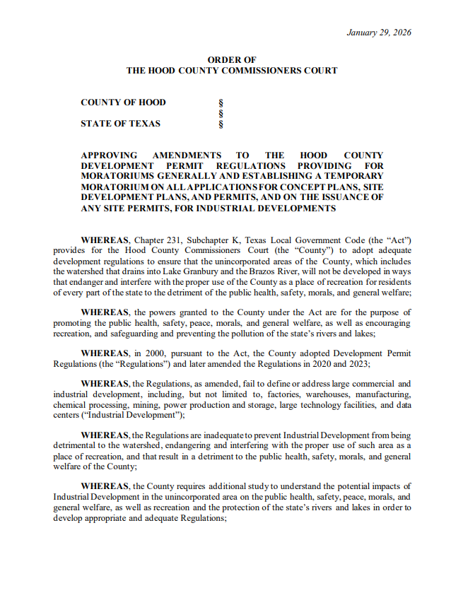 - Hood County, TX residents rally for a moratorium redo; commissioner puts reconsideration on the Feb. 24 agenda.