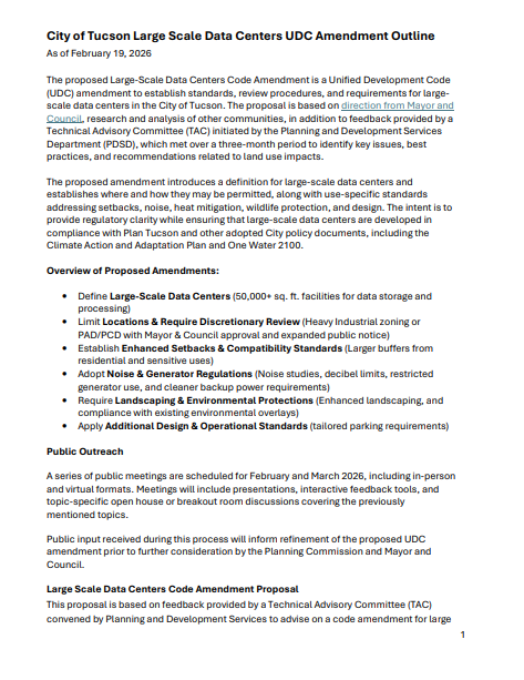 - Tucson, AZ hosts its first public meeting on proposed data center regulations, including potable water and renewable energy rules.
