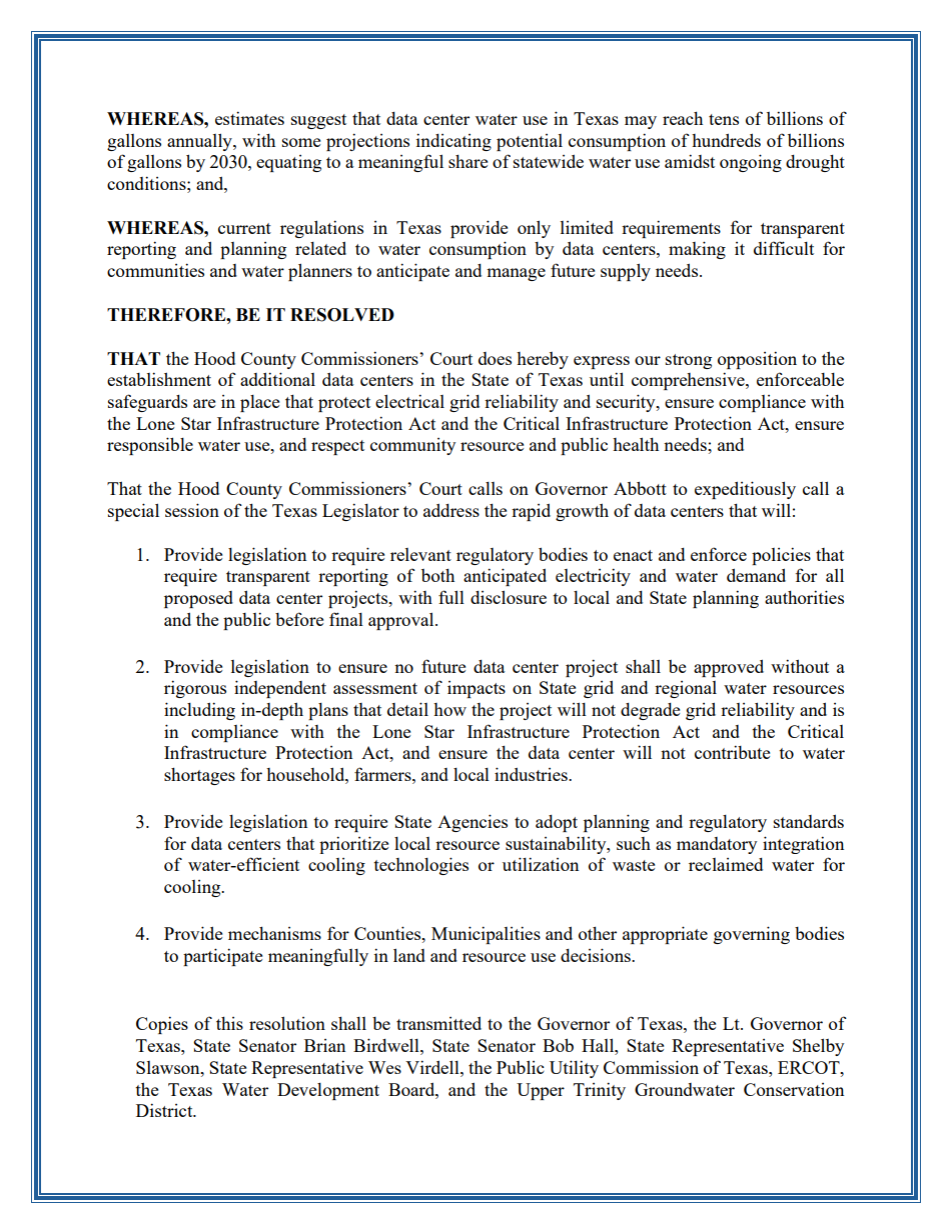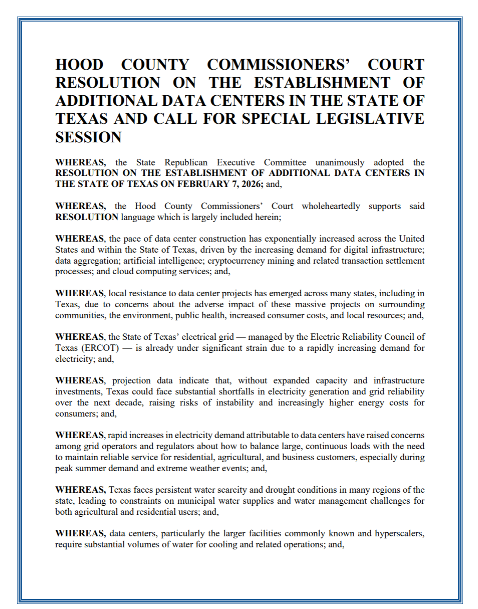 Commissioners will also vote on directing the county attorney to seek an opinion from the Texas Attorney General on whether Hood County has authority to act beyond state law, plus a resolution asking Gov. Greg Abbott to call a special session addressing rapid data center growth.