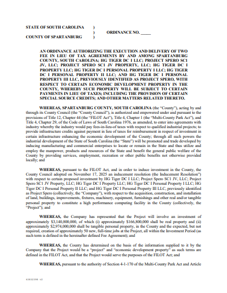 - Spartanburg County, SC state senator asks council to delay a vote on TigerDC's $3 billion Project Spero tax incentive.