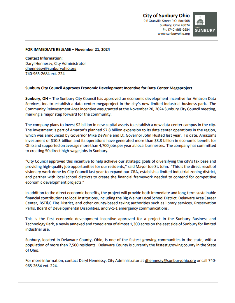 - Sunbury, OH: Rescheduled public hearing on Amazon data center, March 23