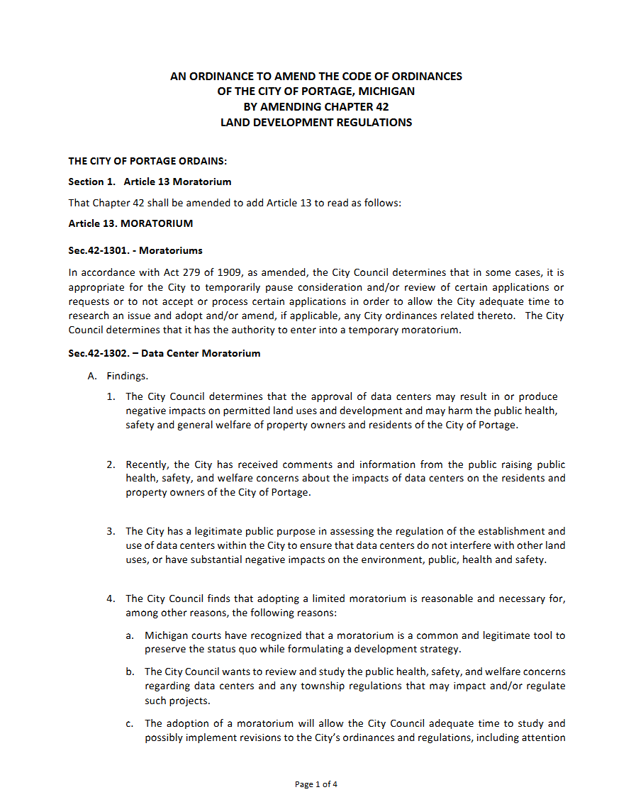 - Portage, MI council expected to approve a temporary moratorium on data centers and energy storage.