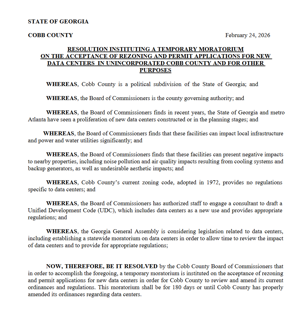 A draft resolution lists potential harms including noise pollution, air quality impacts from cooling systems and backup generators, "undesirable aesthetics," and significant effects on power and water utilities. If approved, county staff would review existing development regulations and propose ordinance changes before any new data center permits are accepted. The Cobb CountyโMarietta Water Authority has cautioned that some facilities can consume more than a million gallons of water per day. The moratorium would expire after 180 days or sooner if officials complete the code updates.