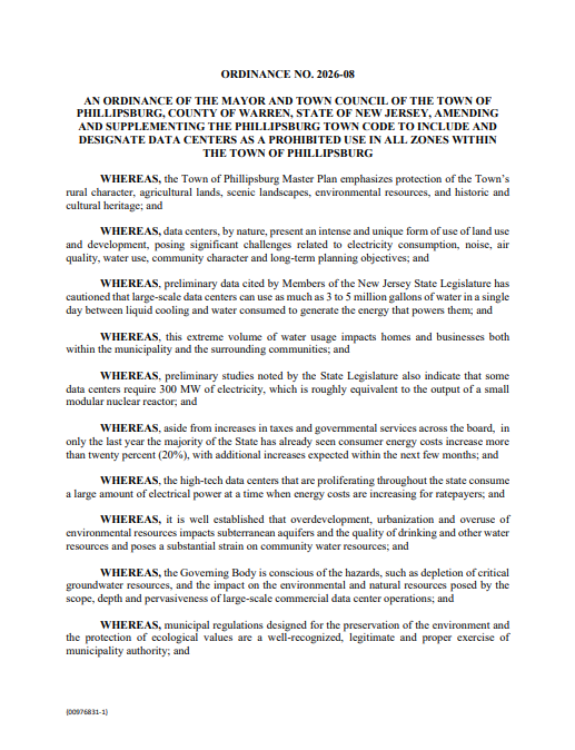 - Phillipsburg, NJ: Public hearing and final vote on data center ban, March 10