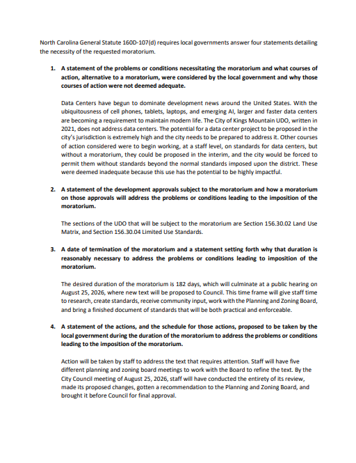 Kings Mountain City Council voted to approve a six-month moratorium on new data center projects, citing concerns over water resources, noise, and power bills.