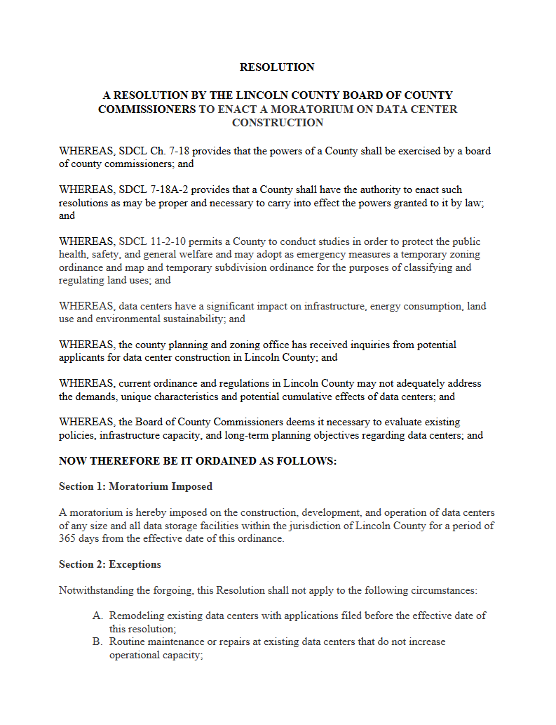 Commissioner Joel Arends brought the resolution after Sioux Falls petitioners failed to get enough signatures for a referendum on a data center rezoning decision. Arends argued the moratorium would let the county act "with facts and not fear."
