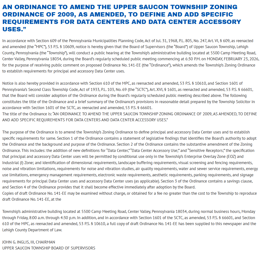 - Pennsylvania: Upper Saucon Township unanimously passes strict conditional-use ordinance for data centers.