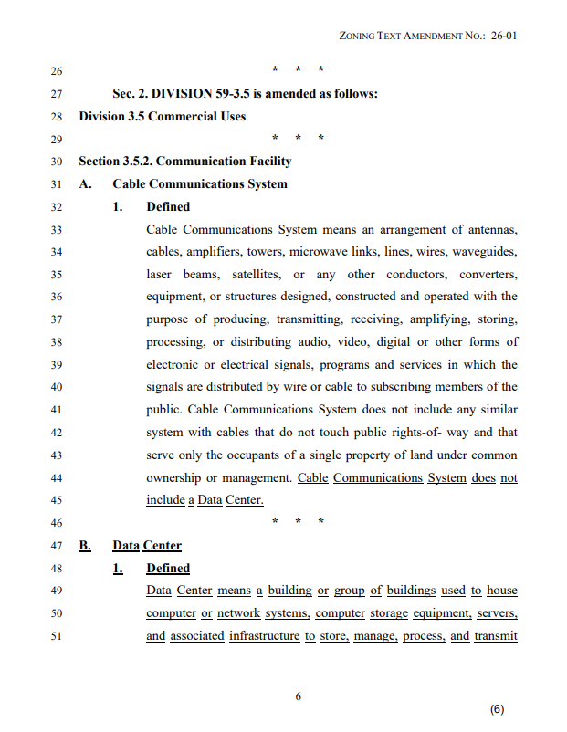The county's planning commission has proposed code amendments that would classify data centers as level-three industrial uses, require special use approval, mandate closed-loop cooling with no evaporative systems, and restrict them to industrial or institutional zones. A moratorium passed in December is set to expire March 6, but commissioners indicated they're likely to extend it.