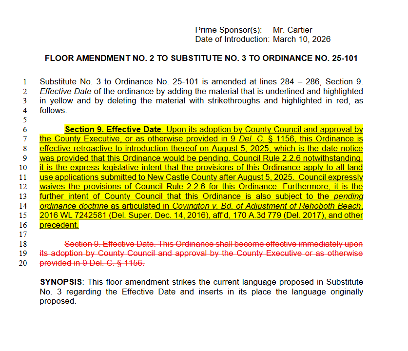 New Castle County Council is set to vote Tuesday on data center regulations, but Councilwoman Janet Kilpatrick filed an amendment Friday evening that would let subdivision plans already in the pipeline convert to data center projects without meeting the new limits. That could exempt projects lingering from years past, including a site near St. George's Bridge filed in 2024.