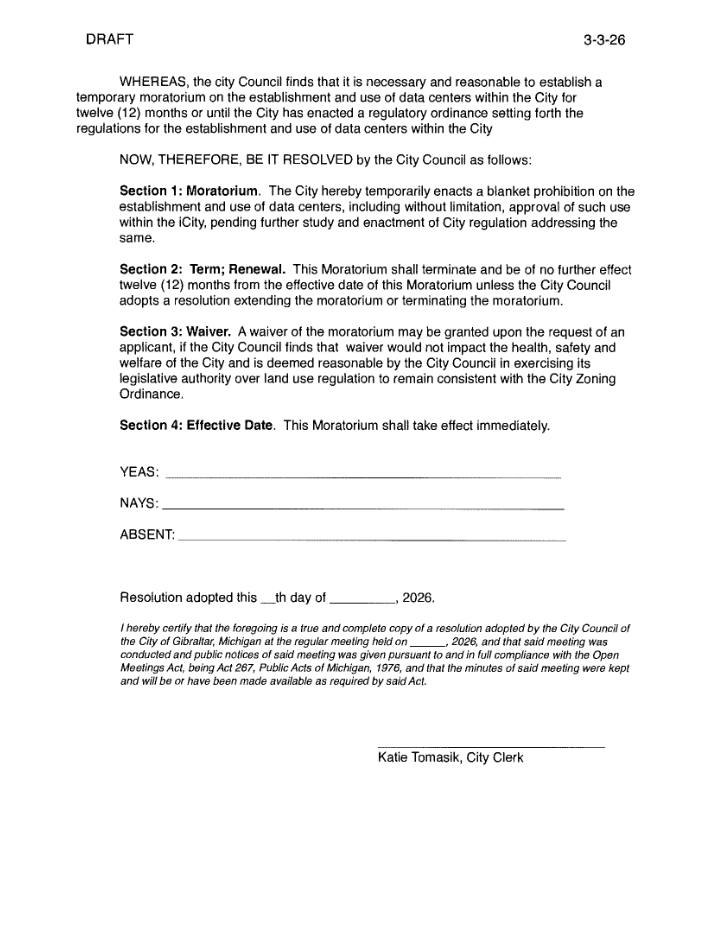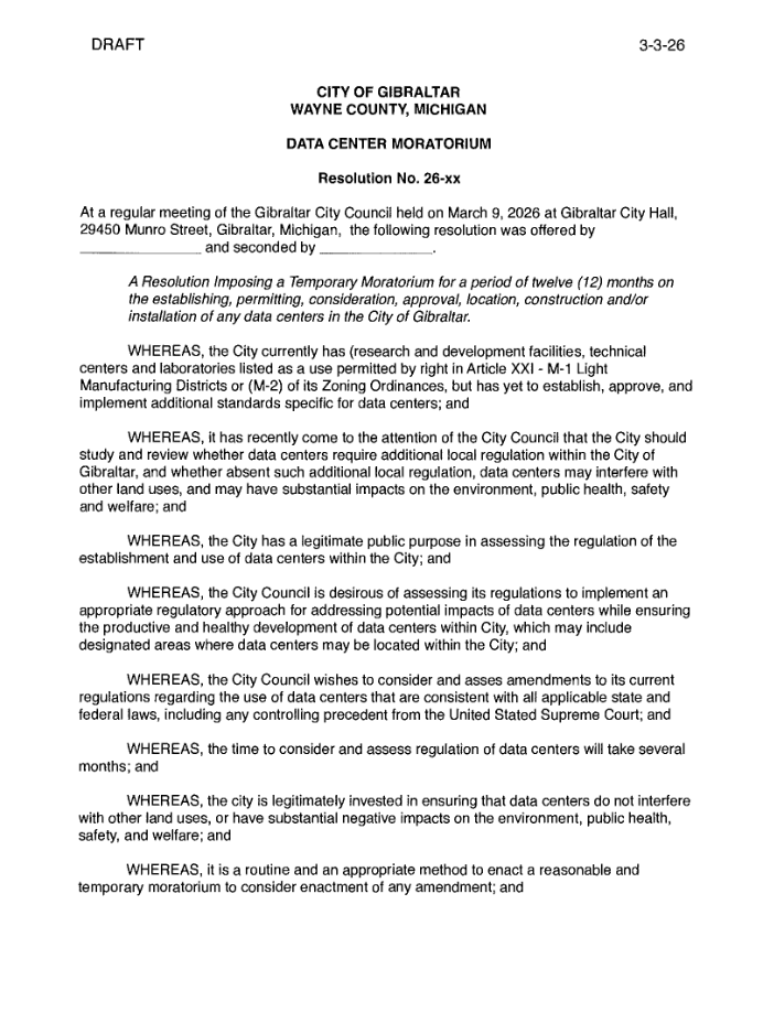 The Gibraltar City Council unanimously approved a year-long moratorium Monday night, freezing all data center proposals including a project by a California company at the former McLouth Steel plant on West Jefferson Avenue. The city will use the pause to study potential impacts on land use, environment, public health and safety.