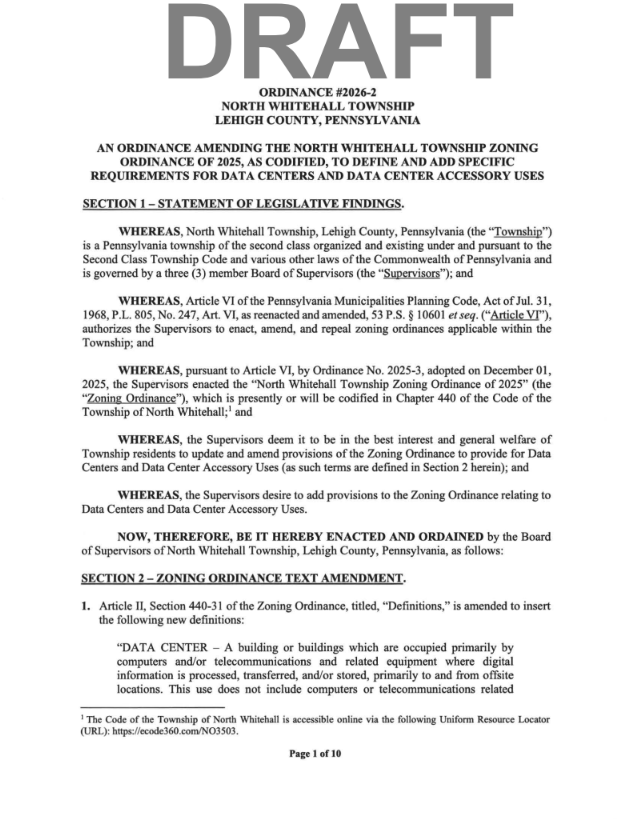 The Board of Supervisors approved a data center ordinance Monday permitting data centers as conditional use in Light Industrial and Mineral Extraction/Industrial districts. But they're already planning tighter rules: a May 11 amendment would limit data centers to the ME/I district only and increase setback and sound study requirements.