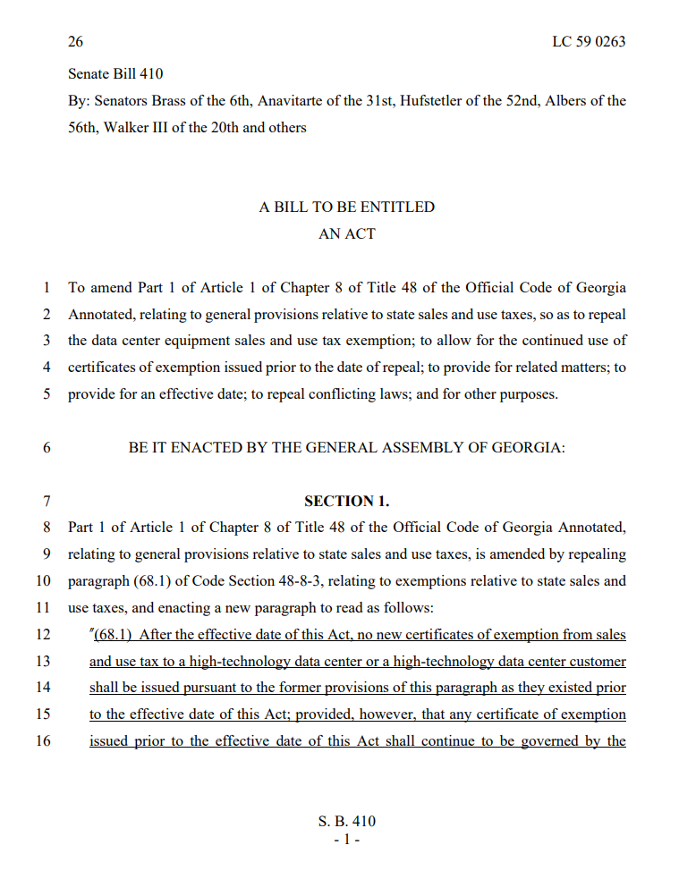 - Georgia: Senate passes SB 410, repealing data center tax exemption. Heads to House.