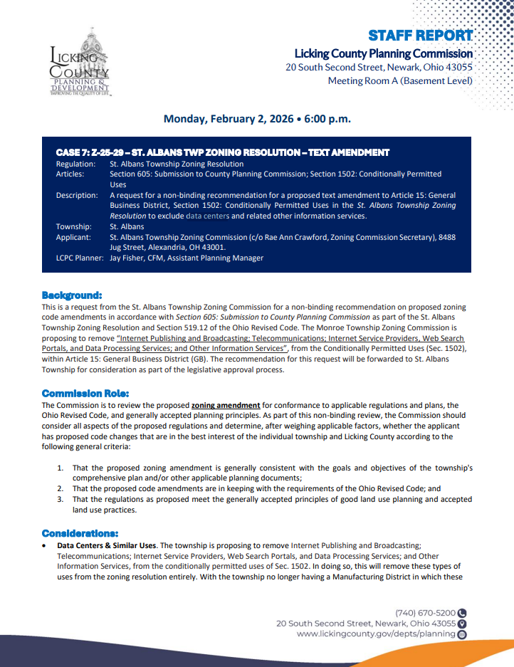 - St. Albans Township, OH holds public hearing on resolution to ban data centers.