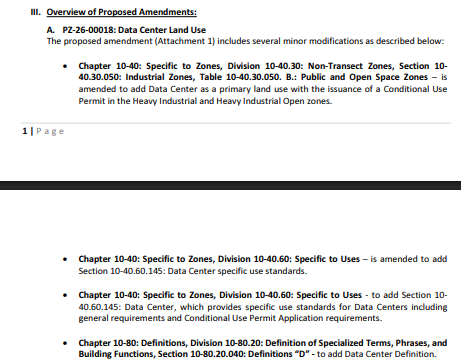 Flagstaff's Planning and Zoning Commission reviewed a proposed zoning code amendment on March 11 that would tighten regulations on where and how data centers can be built. Under the current code, a data center can be built as a Heavy Industrial land use or in a Light Industrial zone with a conditional use permit.