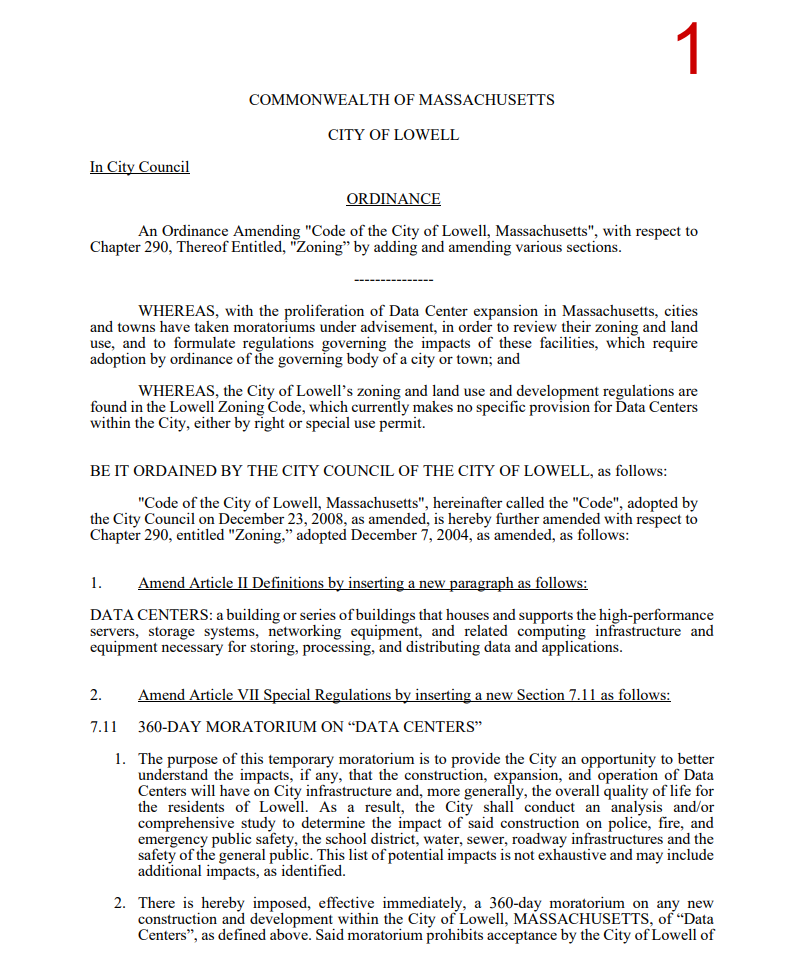 Lowell became the first city in Massachusetts to enact a data center moratorium, imposing a one-year freeze on new development or expansion with a possible 180-day extension.