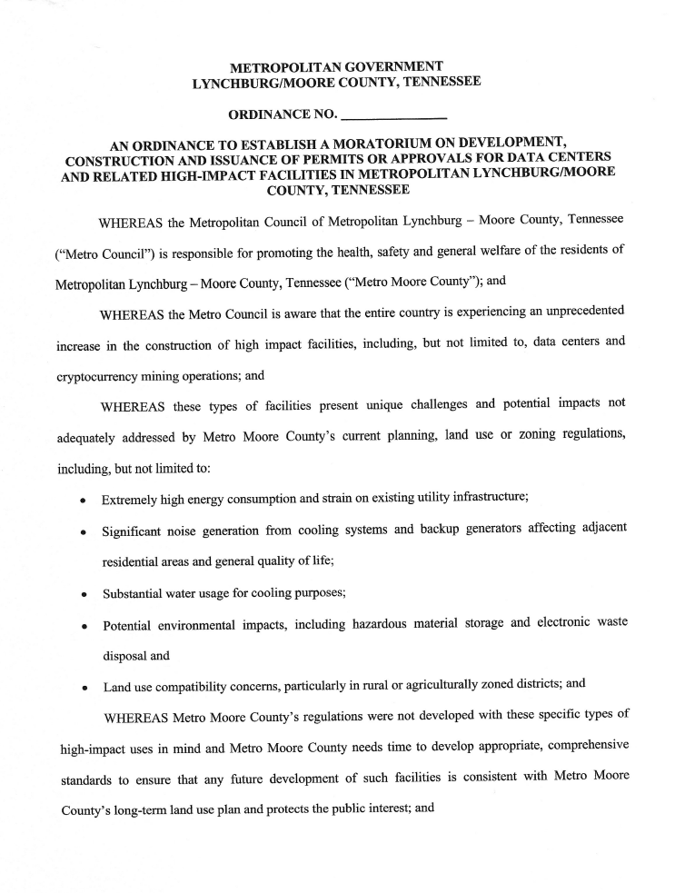 Moore County's Metro Council is holding its first reading Monday of an ordinance that would impose a two-year moratorium on data centers, cryptocurrency mining, and other high-impact processing facilities countywide.