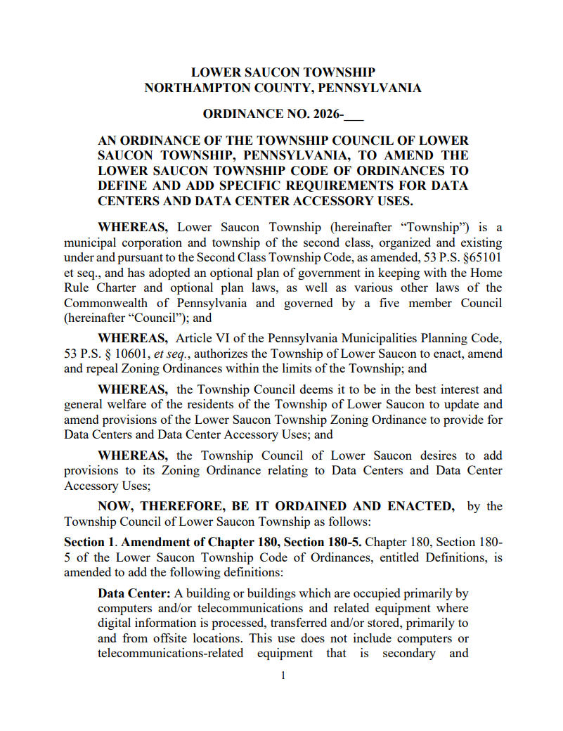 Lower Saucon's Planning Commission reviewed a draft data center ordinance designed to regulate, not prohibit, the use. The draft designates data centers as conditional uses in the Light Manufacturing zone and was modeled after a Poconos-area municipality's ordinance. Commissioners recommended increasing residential setbacks from 200 to 300 feet and roof-mounted equipment setbacks from 300 to 400 feet from roads.