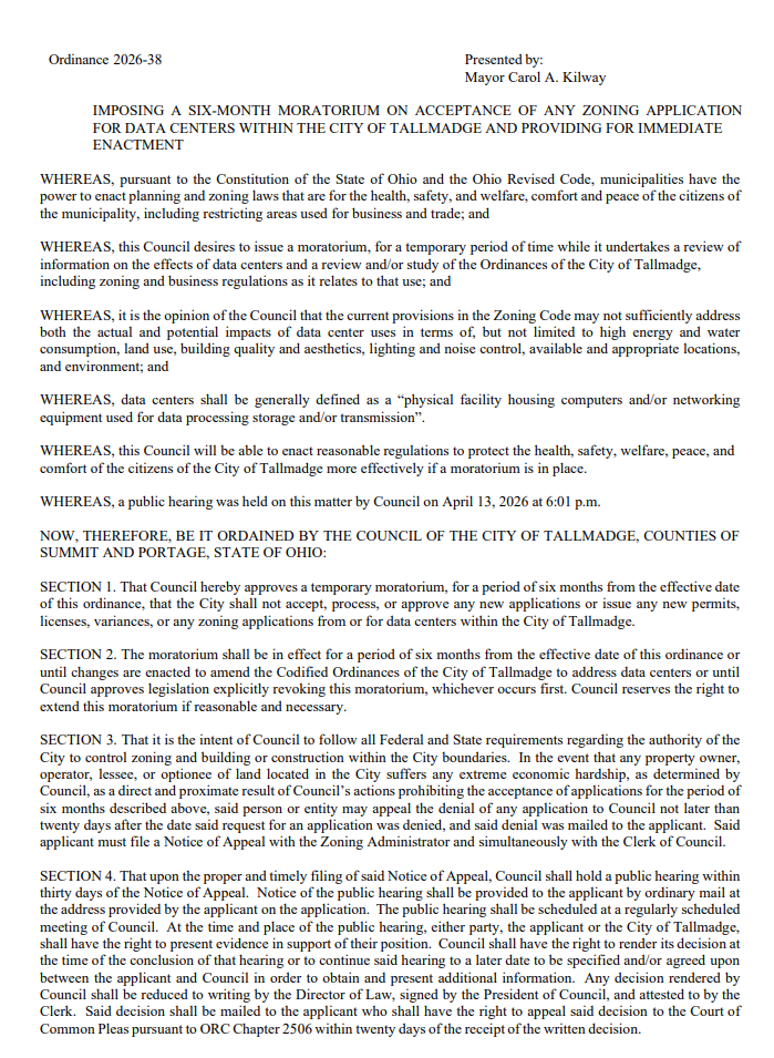 🔗Tallmadge 2026-38 Data Center Moratorium