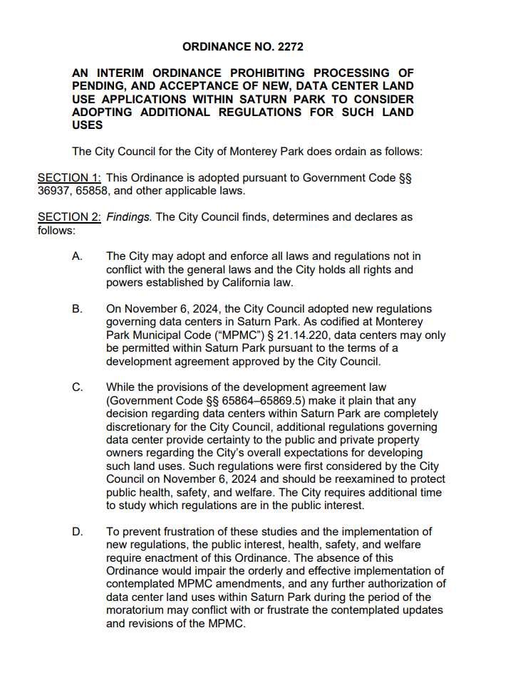 Monterey Park's City Council voted unanimously to extend its data center moratorium to January 2027 and called a special election on June 2, 2026, with a ballot proposition to prohibit data centers citywide.
