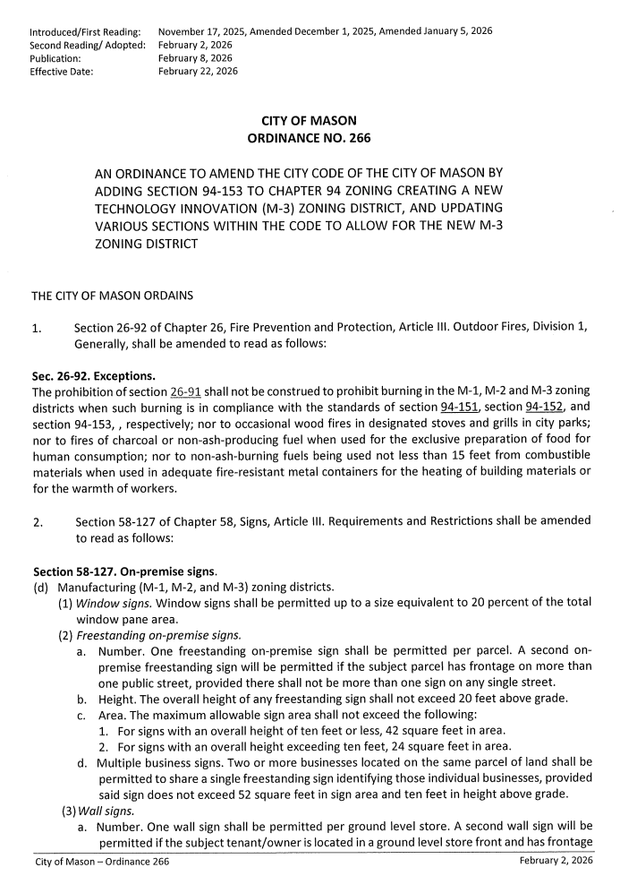 Mason now falls back to M2 state regulations governing data center construction. The city has no immediate timeline for new regulation.