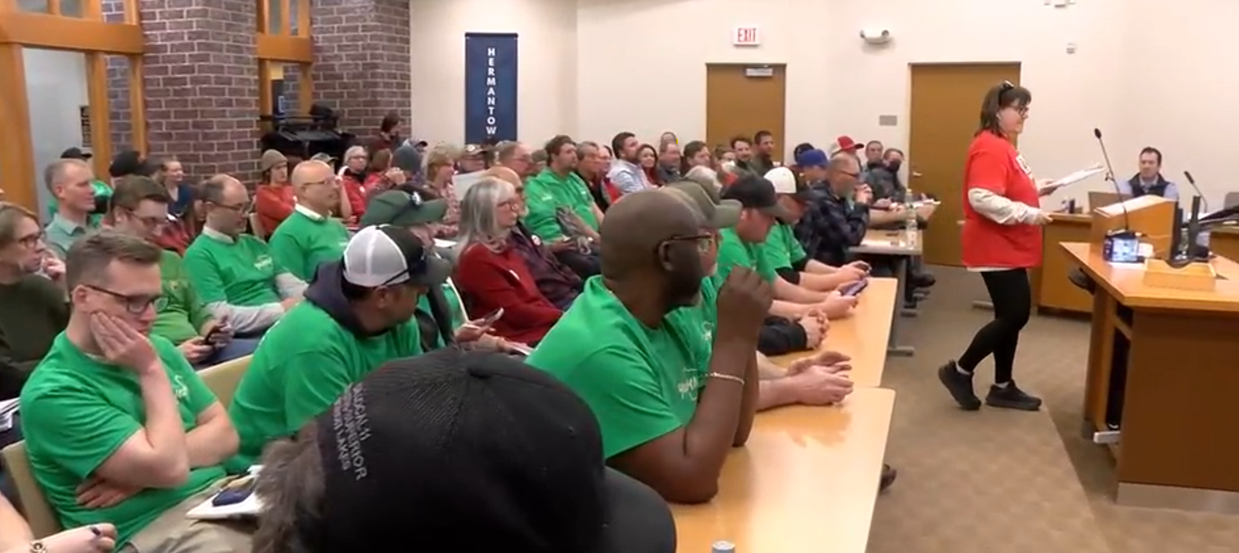 Hermantown held its first city council meeting since the public learned Google is the company behind a proposed hyperscale data center, and the community split was on full display. Members of the grassroots group "Stop the Hermantown Data Center" wore red, while trade union members under "YesMN" wore green.