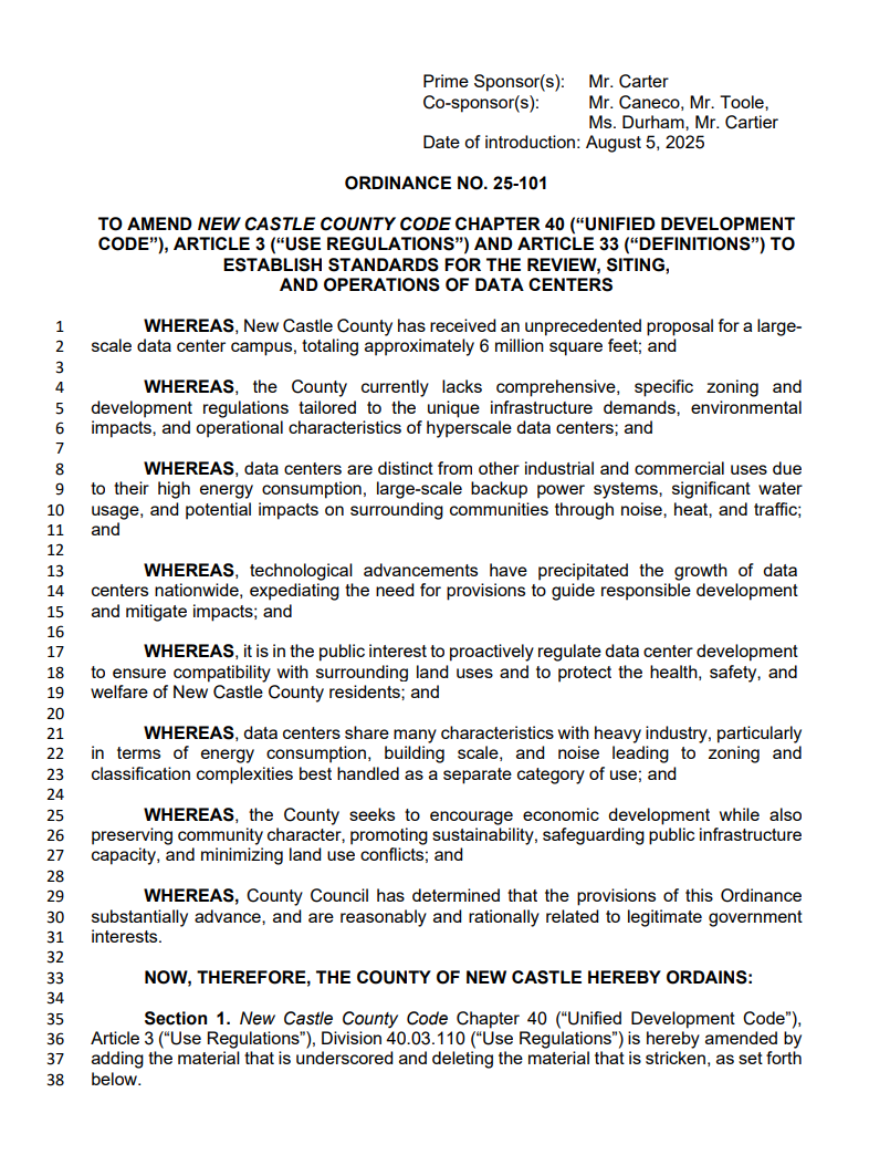 - New Castle County, DE executive signs data center ordinance into law after unanimous council vote.