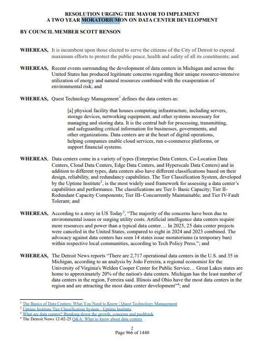 - Detroit, MI council votes to urge a two-year moratorium on data center permits; mayor's office reviewing the request.