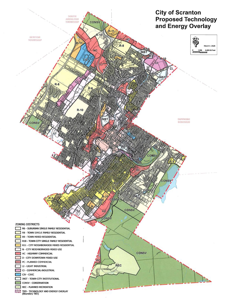 Scranton City Council voted last Tuesday to introduce a pair of ordinances regulating data centers, even though no data center has been proposed in the city. The legislation amends the city's 2023 zoning code to define data center types and create a "Technology and Energy Overlay" district.