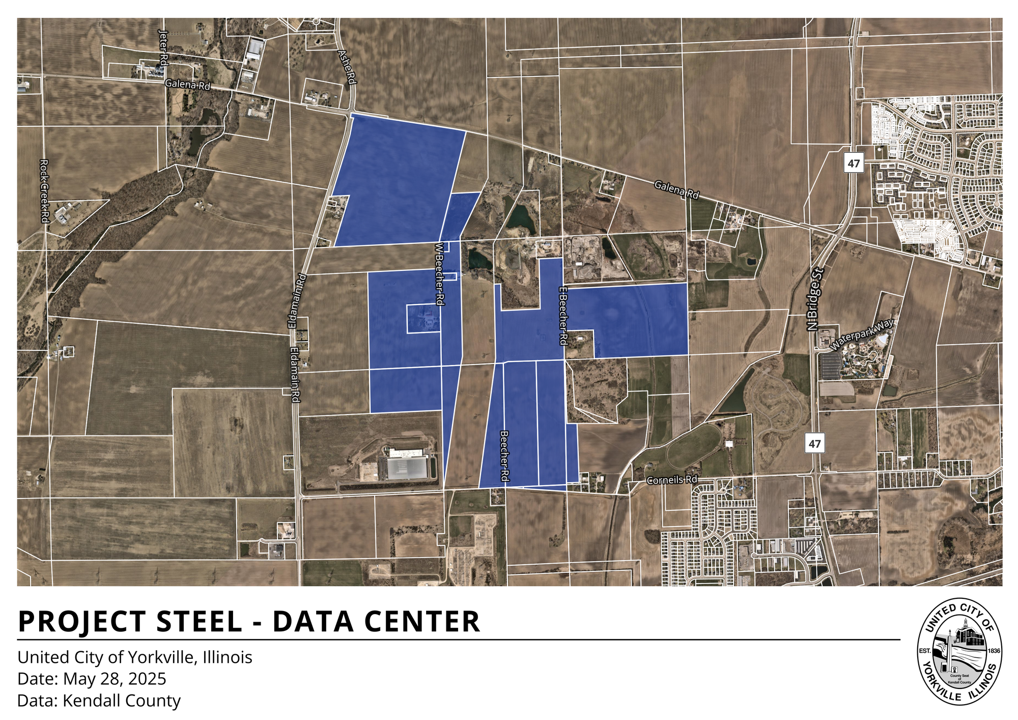 Yorkville City Council approved annexation, a planned unit development, and a development agreement Tuesday for "Project Steel", a 550-acre, 16-building data center campus south of Galena Road and west of Eldamain Road.