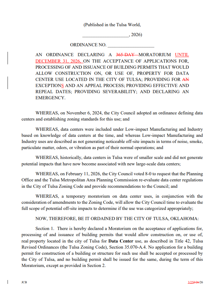 - Tulsa, OK City Council unanimously approves a moratorium on new hyperscale data centers through December 31.