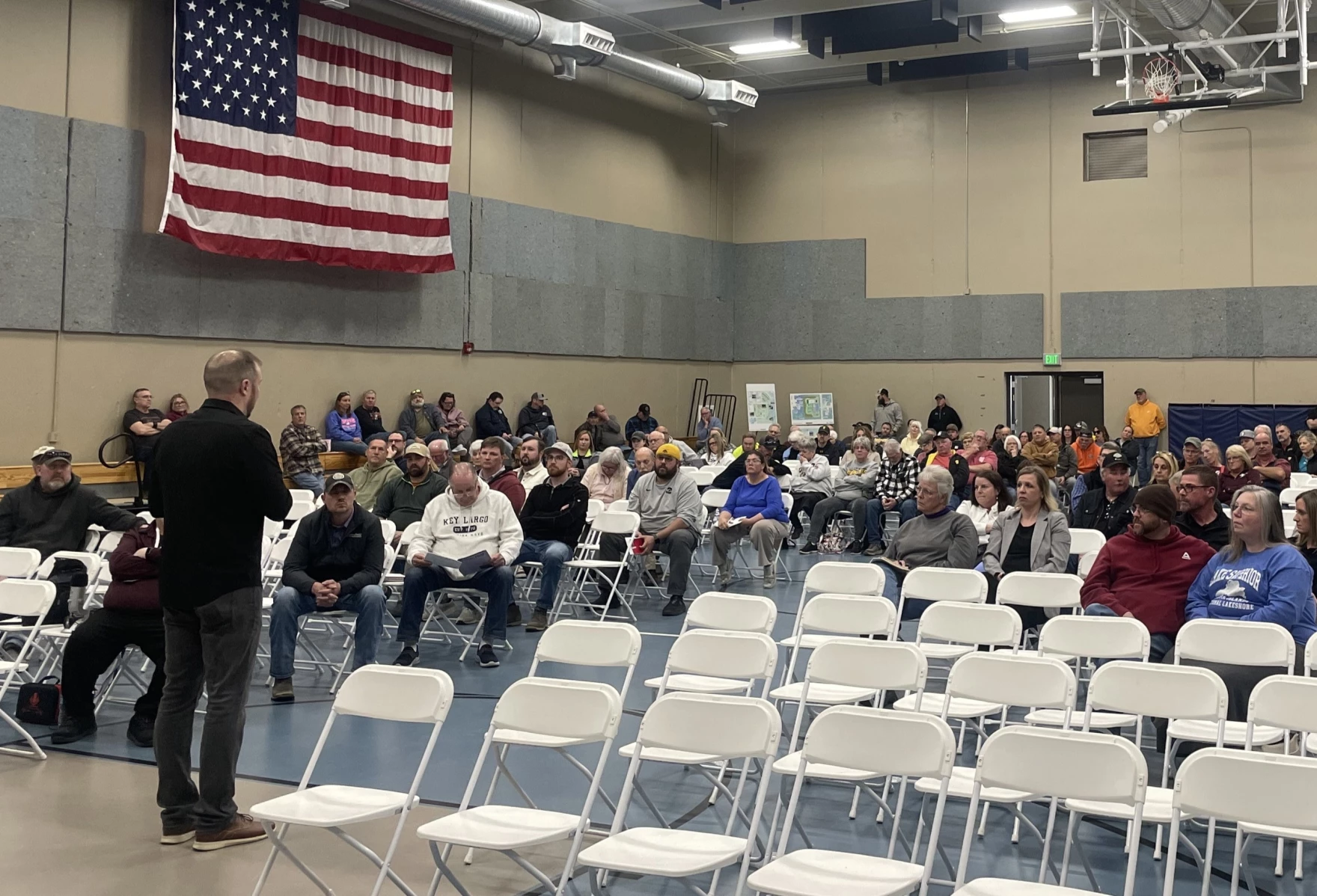 About 400 people packed the Festus High School gym Monday night for a four-hour City Council meeting over a proposed CRG data center development north of Hwy. 67 and west of Hwy. CC. Of the 64 people who signed up to speak, roughly 40 opposed the project and about 10 spoke in favor. Opponents frequently drowned out pro-data center speakers with chants.