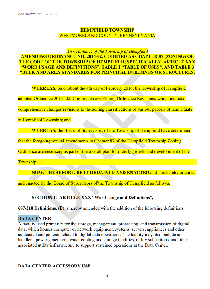 - Hempfield, PA supervisors approve updated zoning restricting data centers to industrial zones before any proposals arrive.