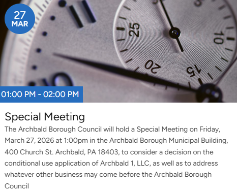 The meeting was called after council postponed Monday's public hearing because The Times-Tribune did not publish required public notices. Under the Pennsylvania Municipalities Planning Code, the borough must hold subsequent hearings within 45 days or the application is deemed approved, putting the deadline at this weekend unless the developer agrees to an extension.
