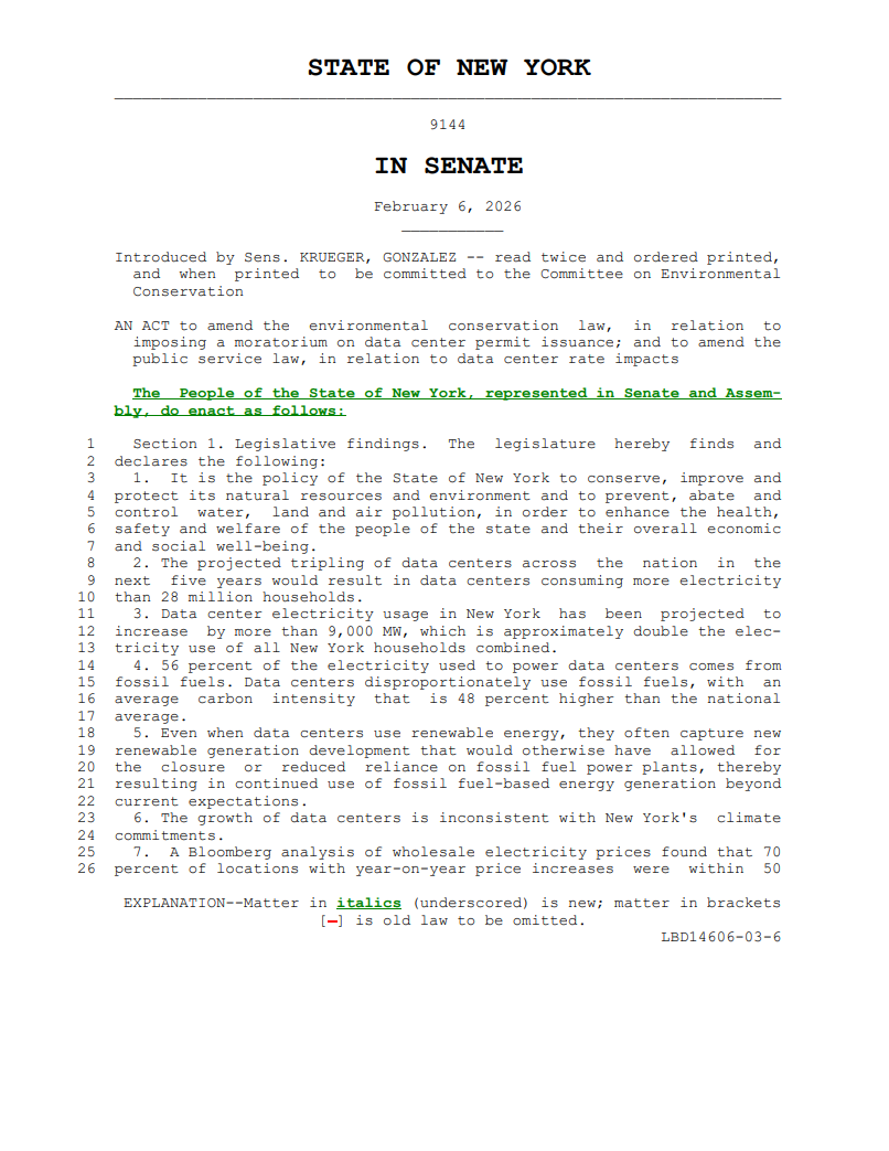 The letter, organized by Food & Water Watch, was signed by groups including Citizen Action of New York, NYPIRG, and New York Communities for Change. The coalition cited a 43% increase in residential electricity rates between 2020 and 2025, warning that data center expansion risks driving bills even higher. The bill would require a comprehensive assessment of environmental and economic impacts before any new data center could be built.