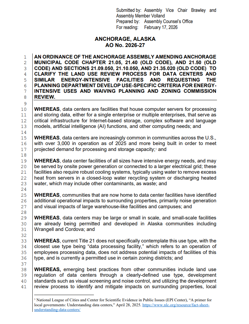 The Anchorage Assembly spent nearly two hours on Feb. 27 examining how to regulate data centers before any formal proposals reach the city, reviewing Ordinance AO 2026-27 during a work session.