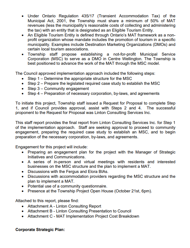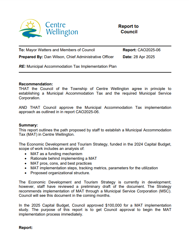 Centre Wellington is moving ahead with plans to introduce a municipal accommodation tax (MAT), with unanimous council support and staff now preparing for community engagement.