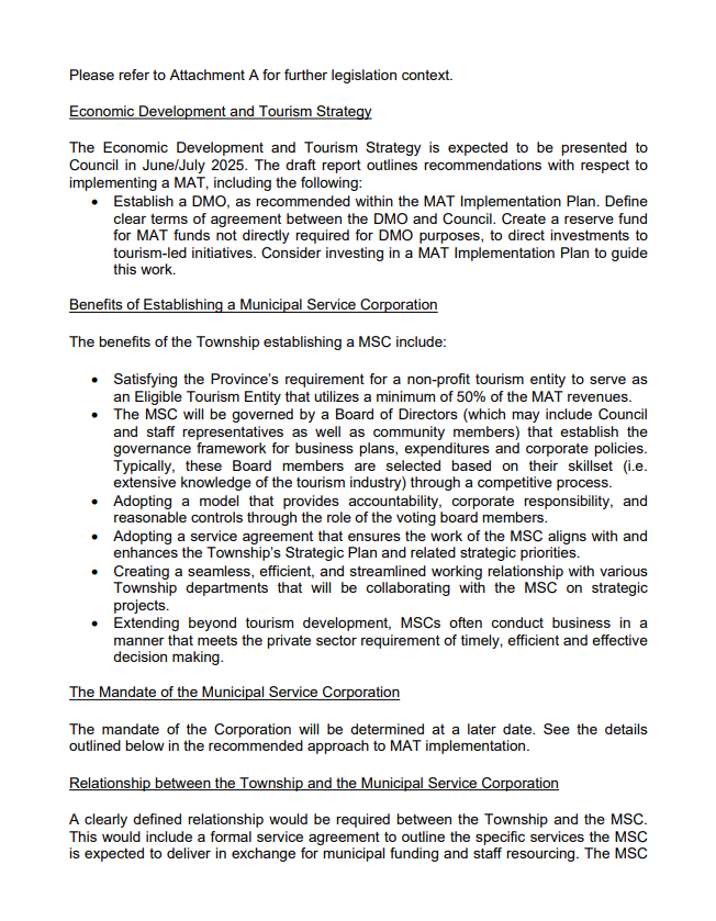 The tax, typically set between three and six per cent, would apply to short-term accommodations to help fund tourism and local infrastructure. Consultant Kelly Linton recommended creating a municipal service corporation (MSC) to oversee the program, supported by MAT revenue, paid parking, and a share of OLG funds. The MAT is expected to launch alongside a new short-term rental bylaw in 2026, with officials stressing that the tax will ensure visitors contribute fairly to the township’s growth while supporting tourism oversight and safety.