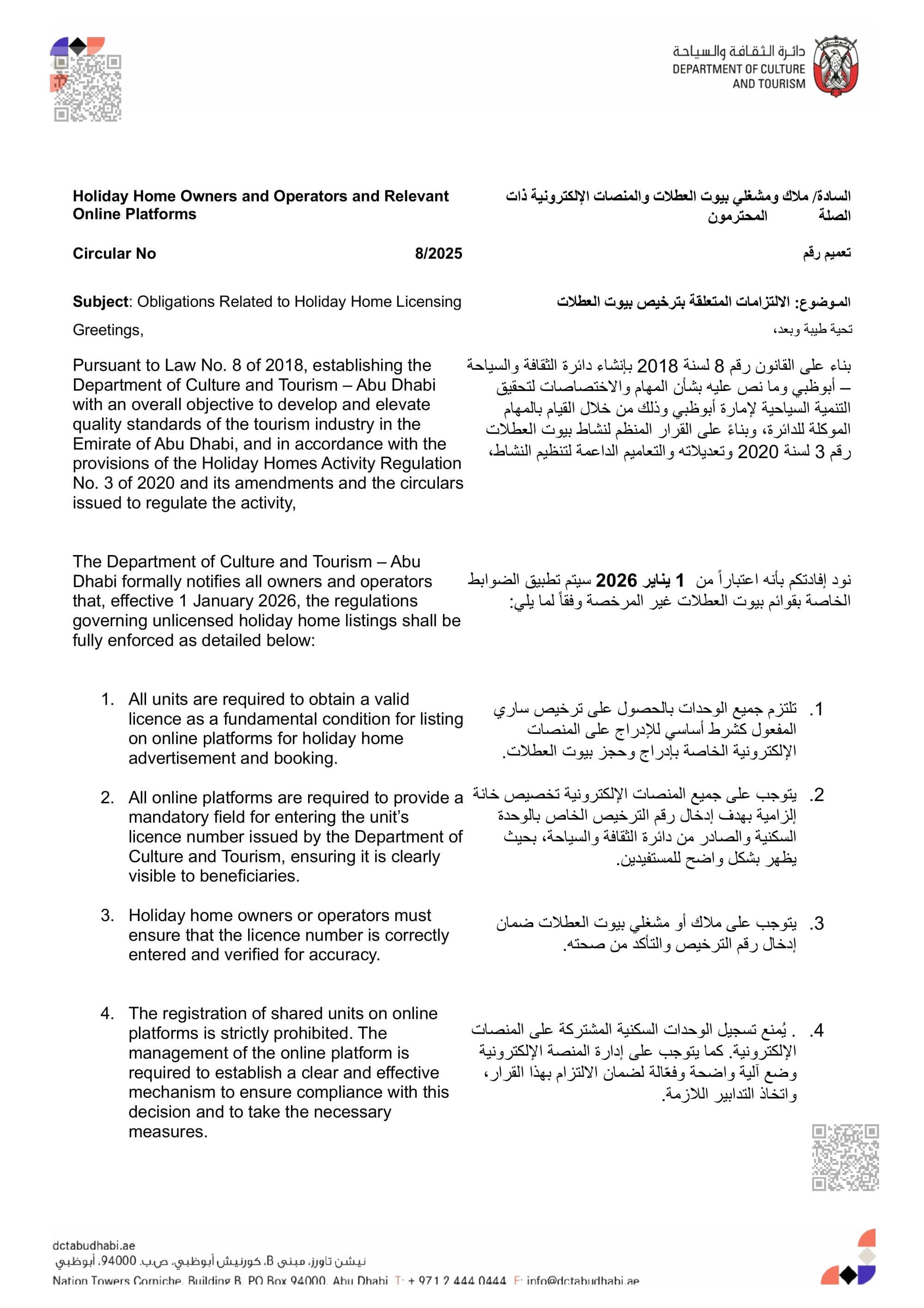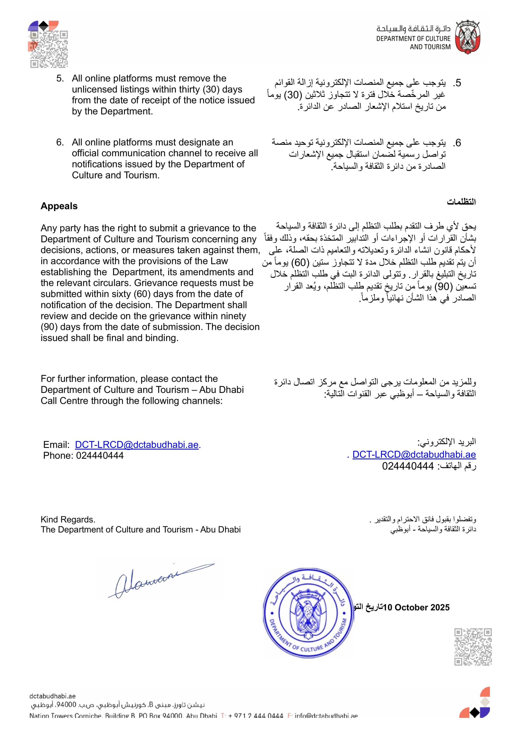 The Department of Tourism and Culture (DCT Abu Dhabi) announced Circular No. 8/2025, which takes effect on January 1, 2026, banning unlicensed units from digital platforms and mandating visible licence numbers on all listings. The circular also extends licensing to farmhouses, supporting agri-tourism growth and promoting authentic Emirati-led experiences.