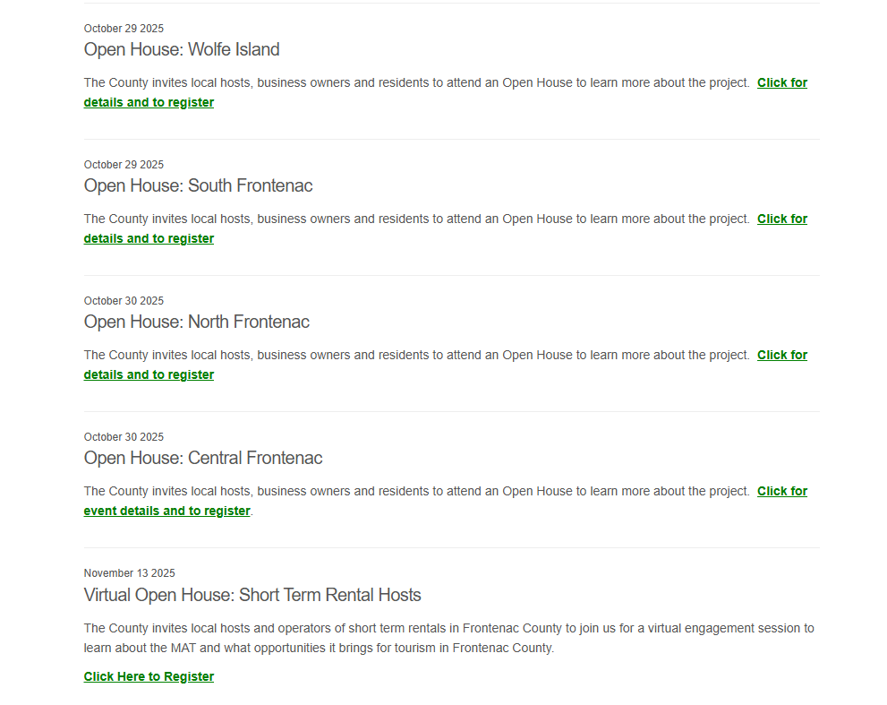 Frontenac County is holding a series of open houses this week to gauge public feedback on introducing a Municipal Accommodation Tax (MAT) for short-term rentals, including cottages, resorts, and B&Bs.