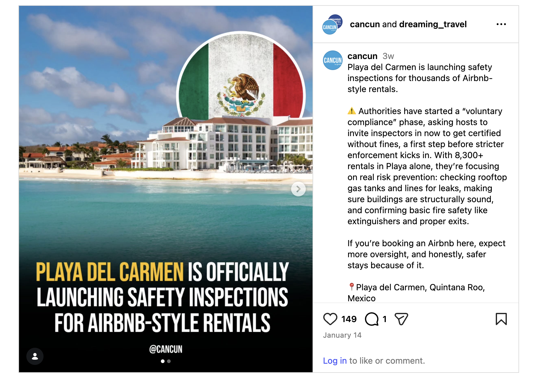 Playa del Carmen initiated a staged safety enforcement program offering voluntary Civil Protection inspections assessing gas, fire, and structural compliance. Hosts can rectify deficiencies during this grace period before penalties commence.