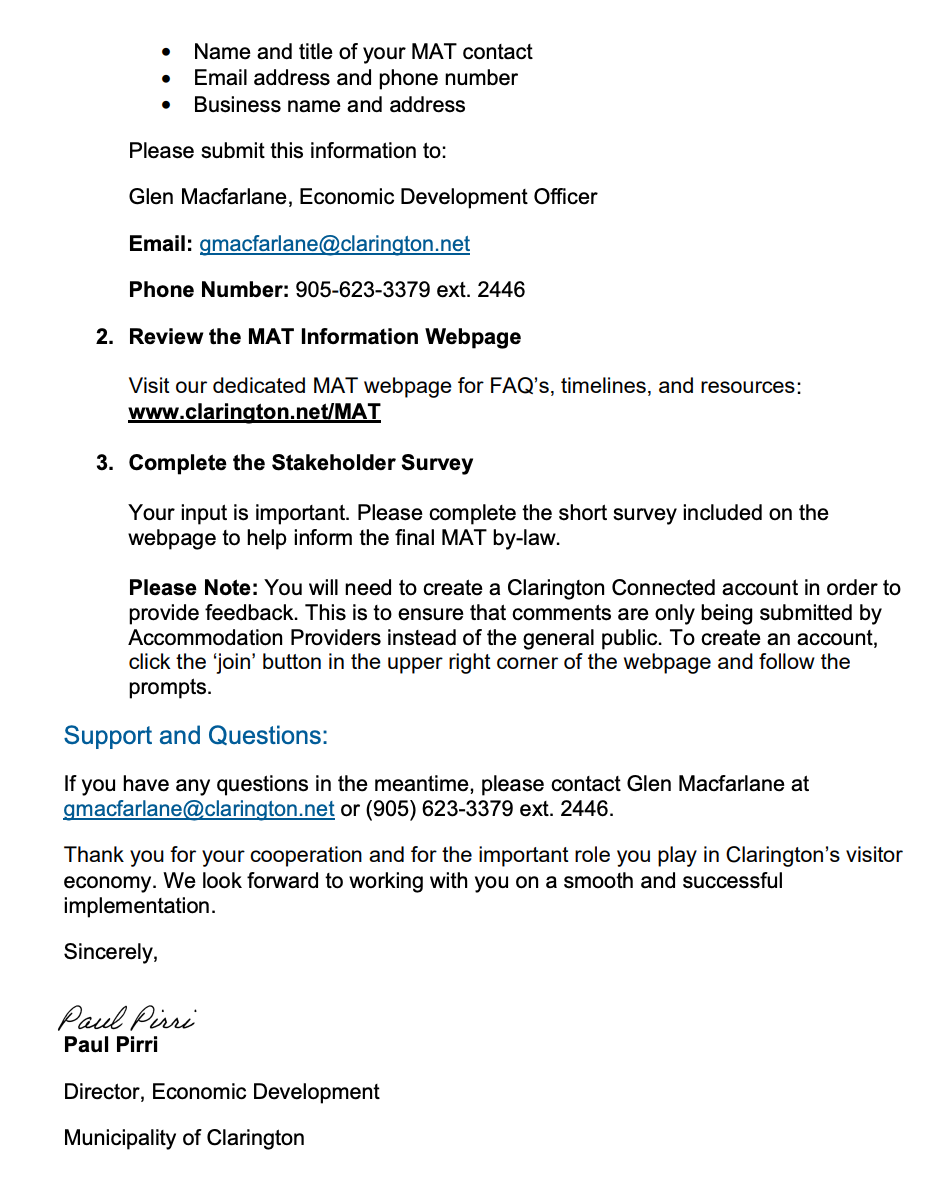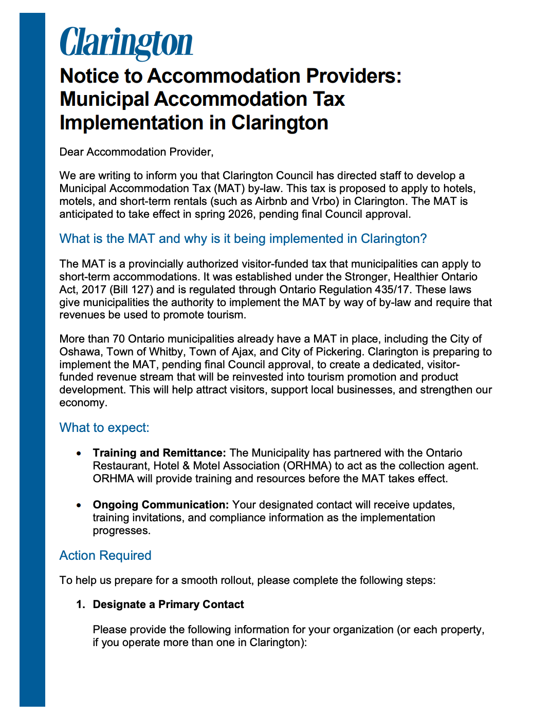 Administration will be contracted to the Ontario Restaurant, Hotel and Motel Association at 1.8% of remittances. The move brings Clarington in line with more than 70 Ontario municipalities that already collect a MAT including all of its Durham Region neighbours.