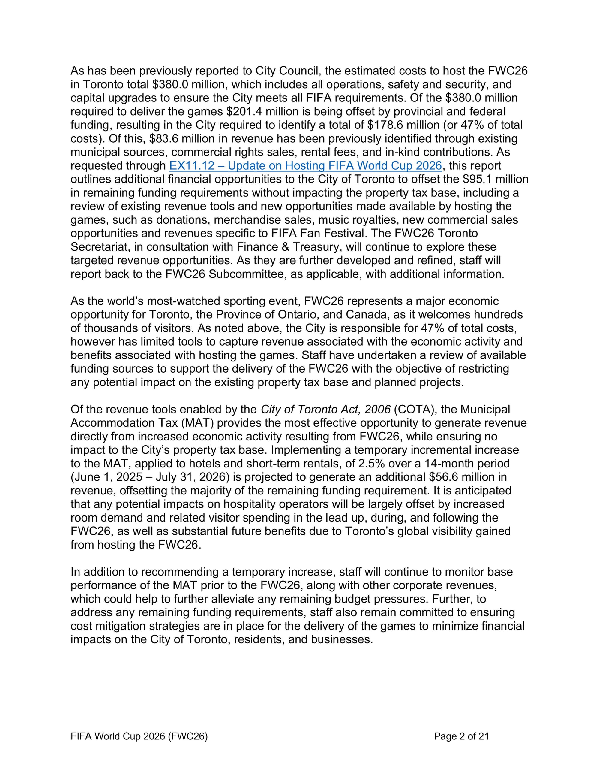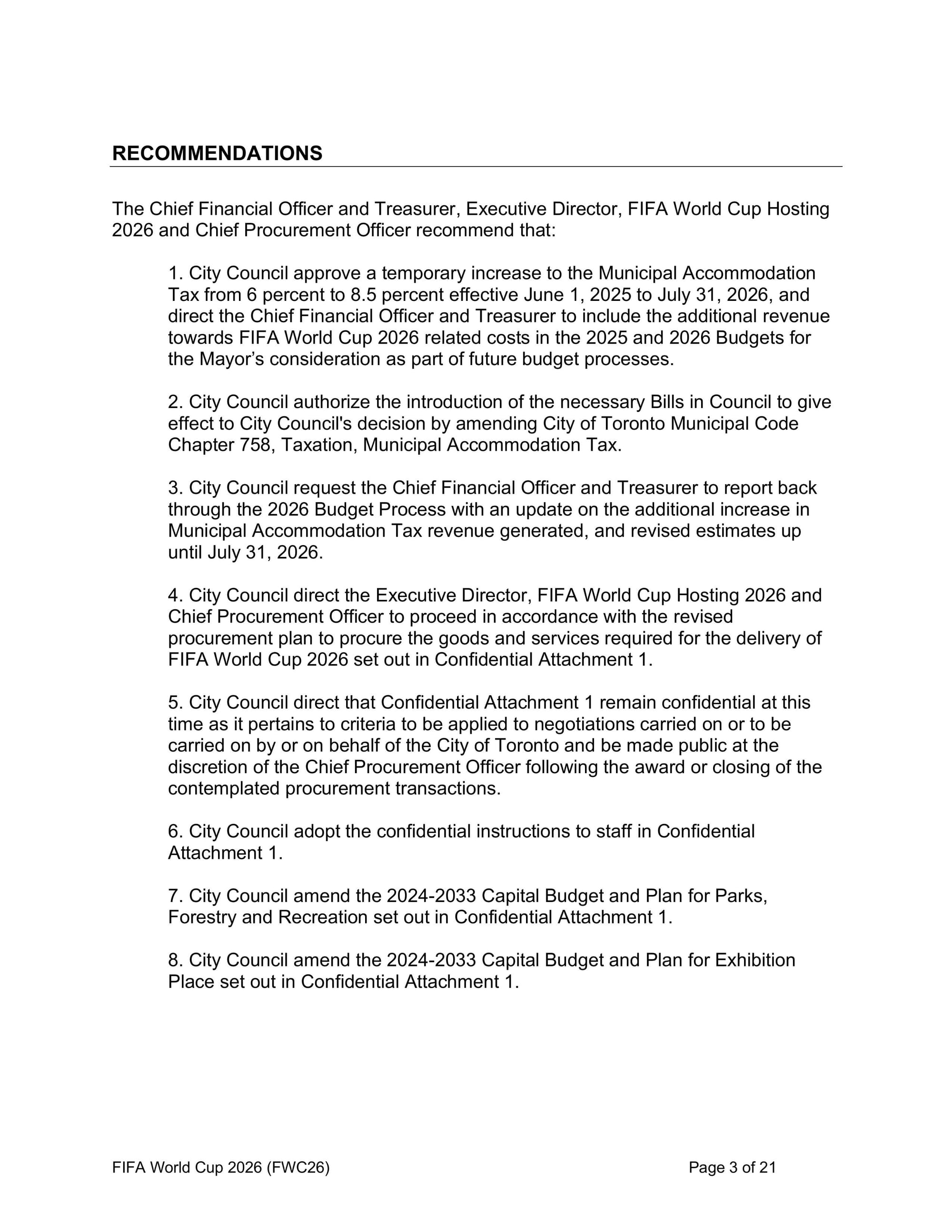 Toronto is moving ahead with a temporary 2.5% increase to its Municipal Accommodation Tax, bumping the total to 8.5% from June 2025 through July 2026, as part of its strategy to help fund its $380 million FIFA World Cup hosting costs.