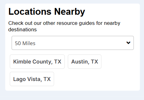 Location guides now show other cities and counties within 10, 25, 50 or 100 miles.