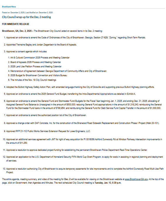 While the rest of the meeting covered various routine city matters, from capital projects to police operations, the short-term rental amendments were the clear headliner for those in the STR community. With these new rules in place as of December, Brookhaven hosts now enter the new year with a clearer rulebook—and a firmer expectation to stay compliant.