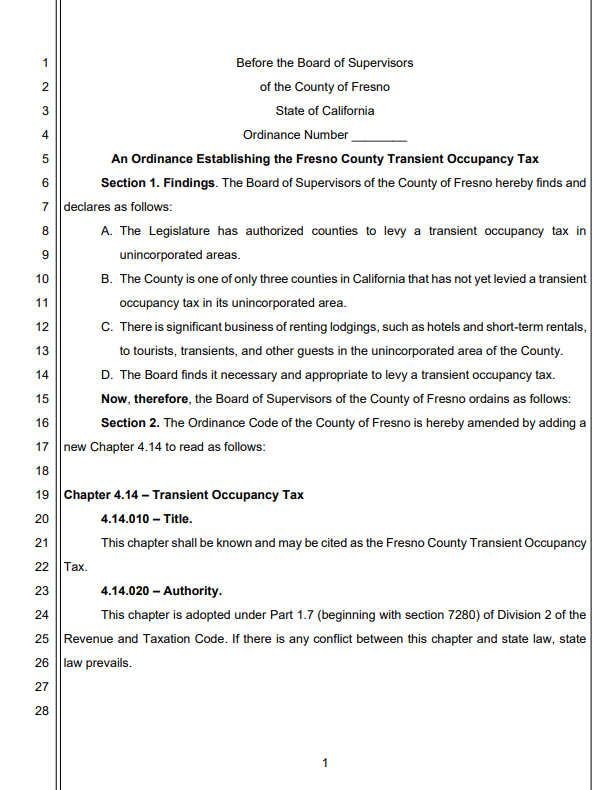 County staff noted that Fresno is one of only three counties in California without a TOT, and the only one without such a tax despite having hotels and short‑term rentals in its jurisdiction. Cities within the county, including Fresno and Clovis, already levy their own TOTs.