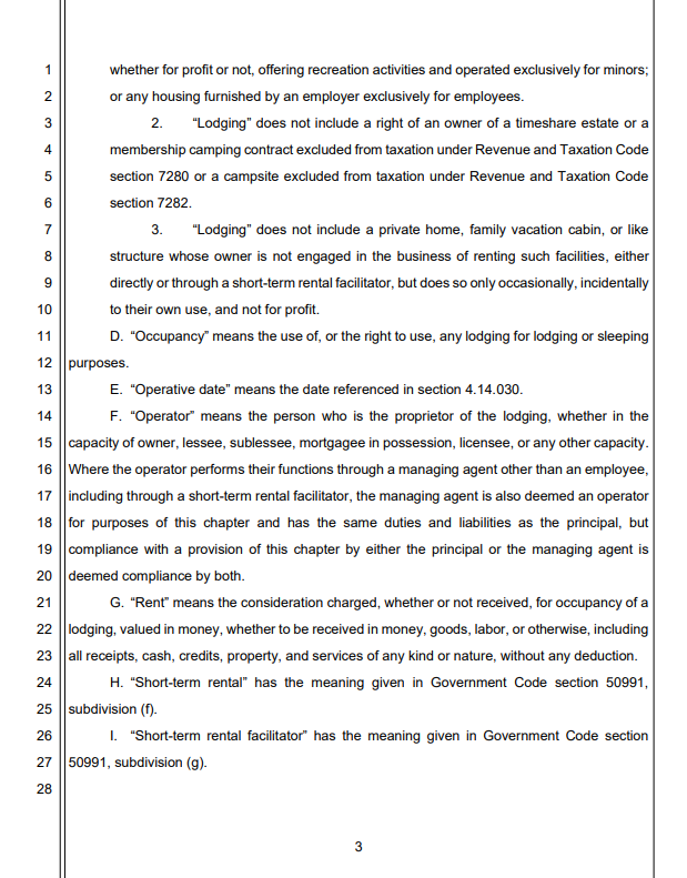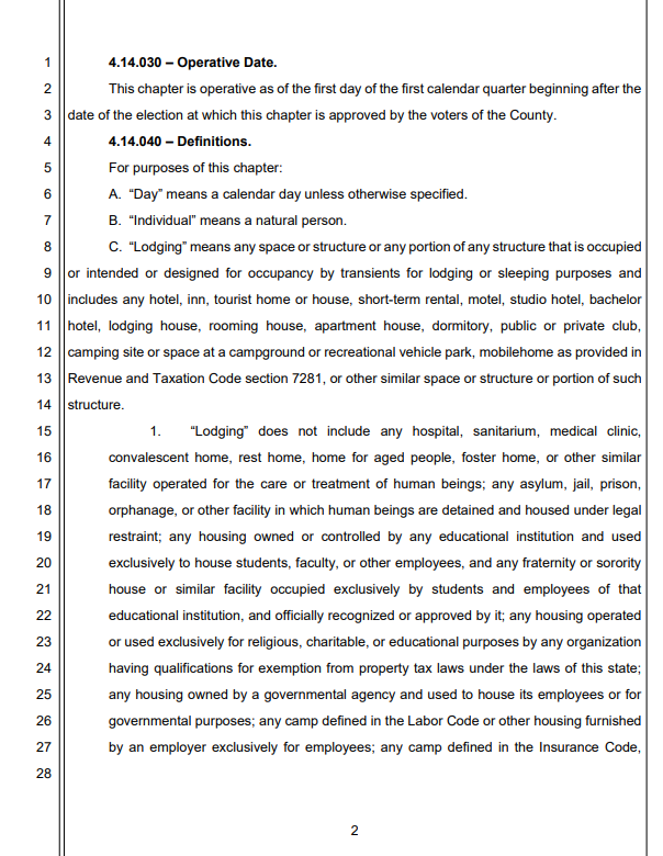 The TOT would apply to short‑term stays of 30 days or less. Lodging operators would be responsible for adding the tax to rental rates and remitting it to the county tax collector. Longer‑term rentals and county residents would be exempt.